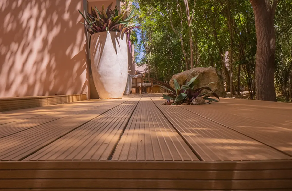Decks compostos de madeira ecológica e HPDE com acabamento natural amadeirado e grande resistência a fatores externos, como chuva e sol.