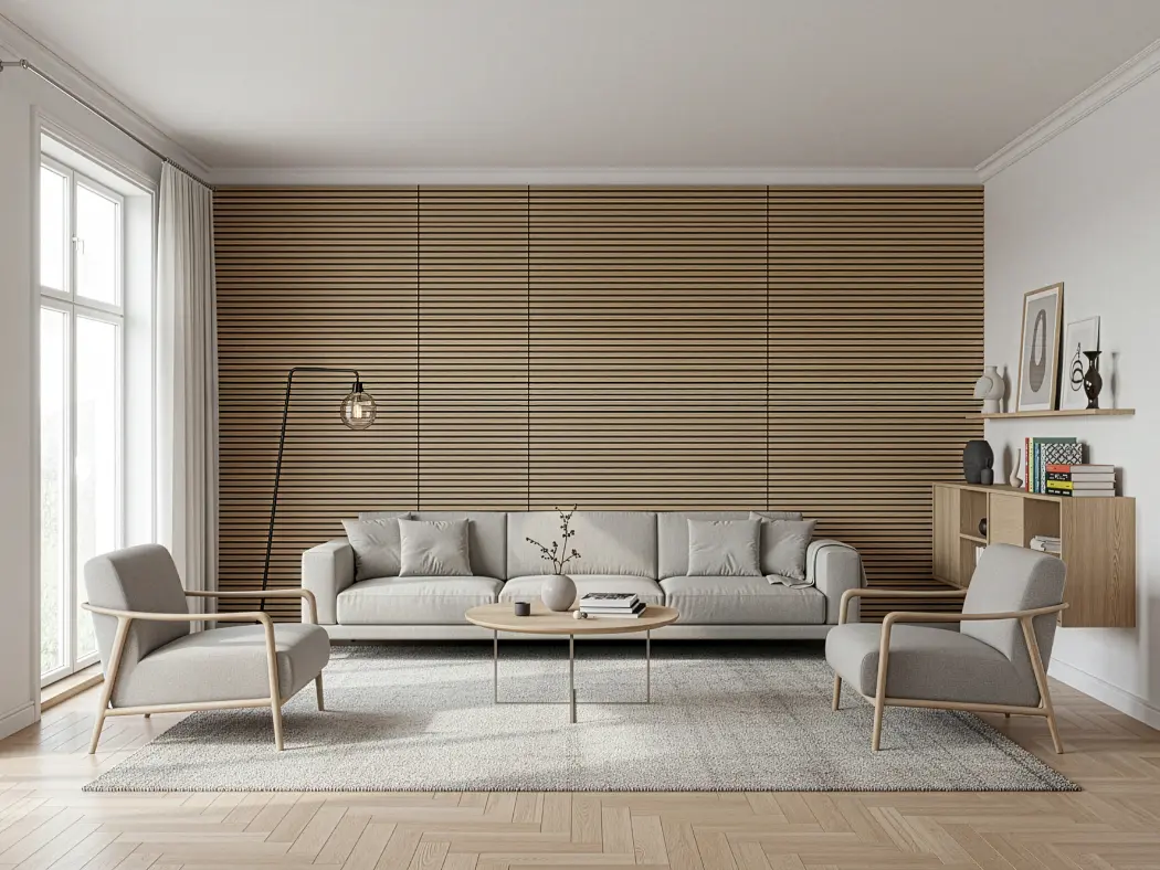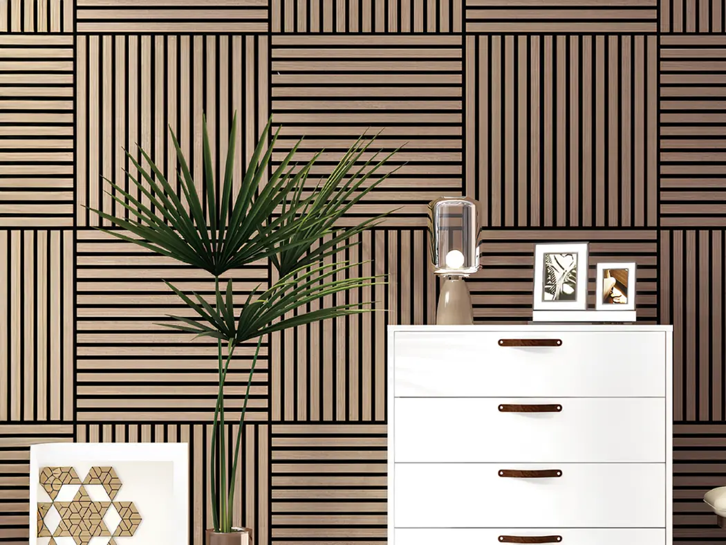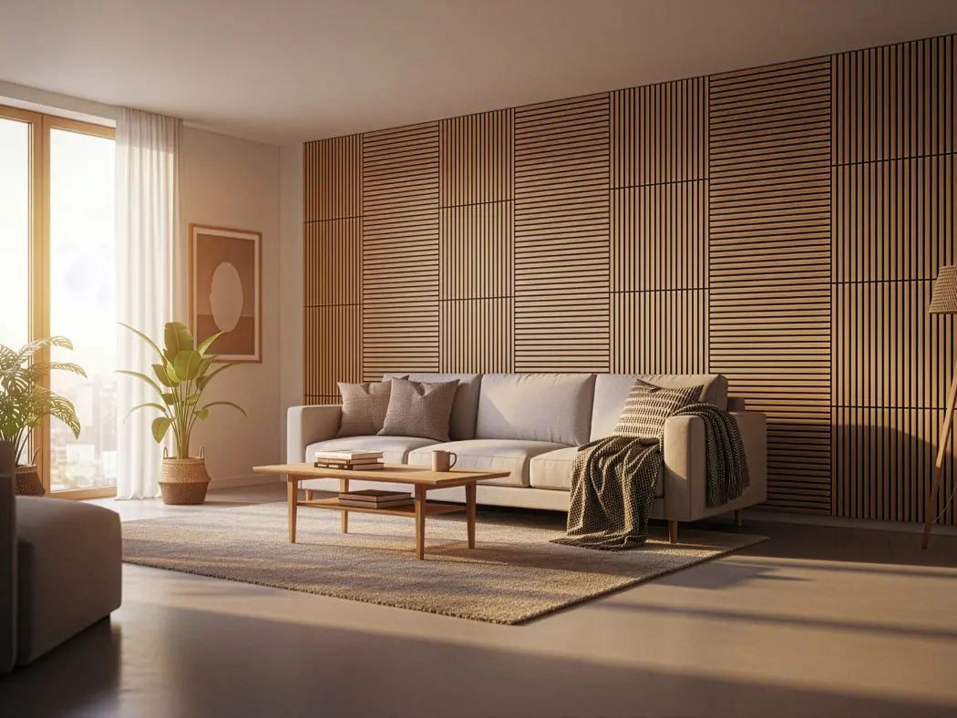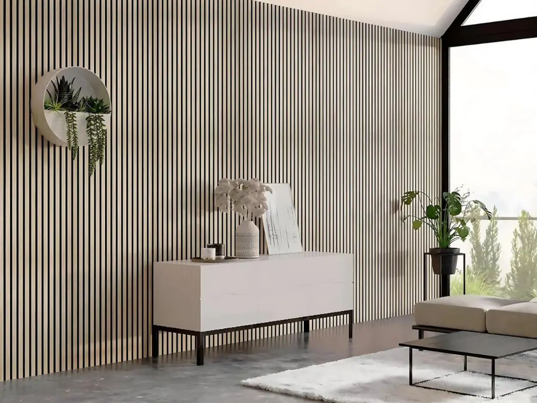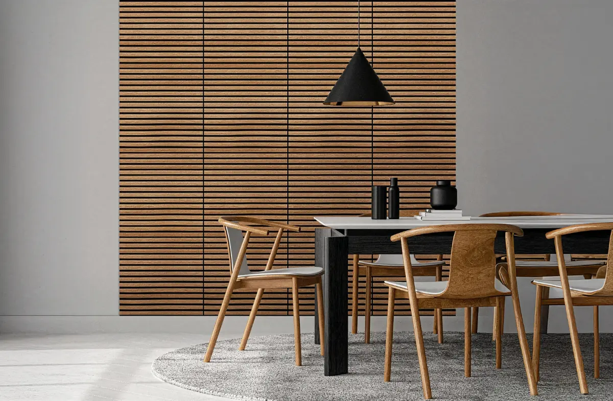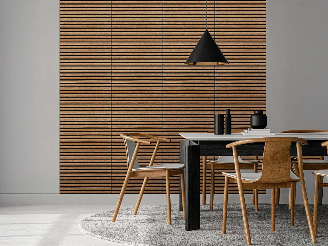 Painéis acústicos de madeira que combinam conforto, estética e funcionalidade. Compostos por MDF e fibra de poliéster PET, com propriedades de absorção sonora, oferecem um acabamento aconchegante. Seu design em estilo painel ripado melhora a absorção acústica. Uma solução sustentável e versátil para valorizar o design de qualquer ambiente.