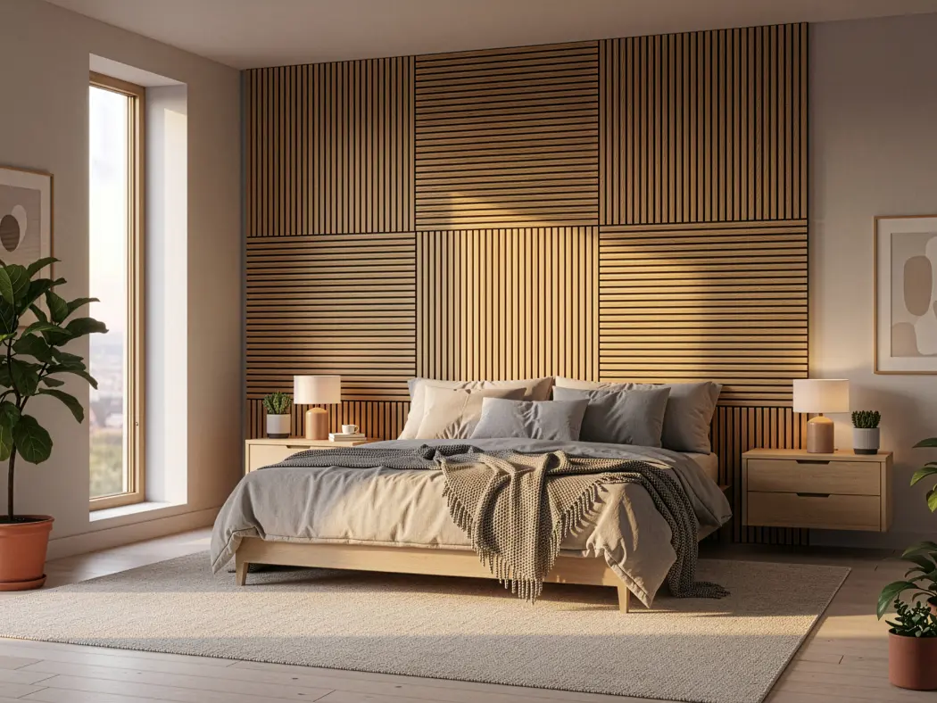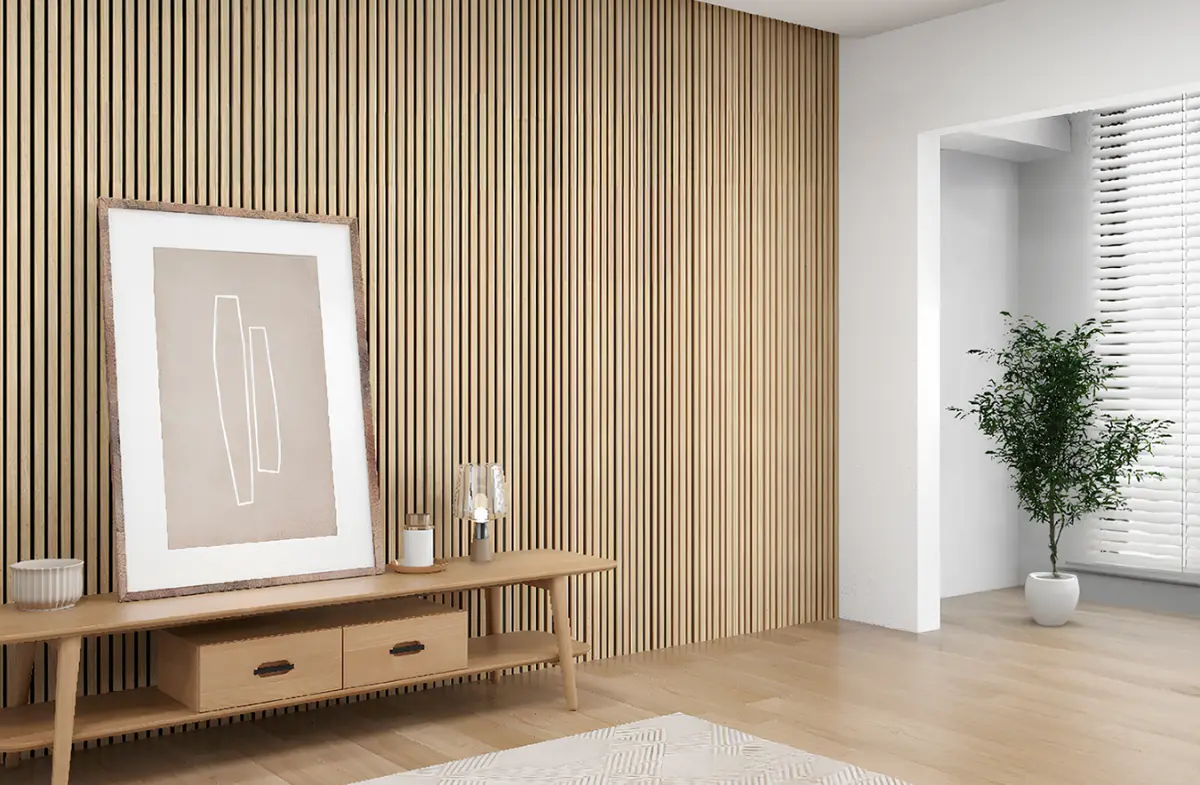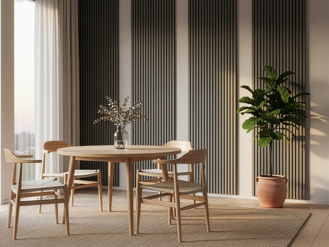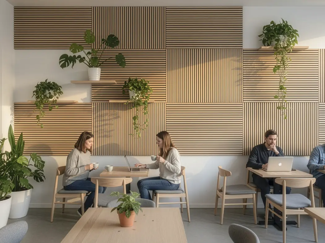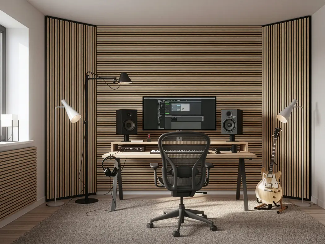 Painéis acústicos de madeira que combinam conforto, estética e funcionalidade. Compostos por MDF e fibra de poliéster PET, com propriedades de absorção sonora, oferecem um acabamento aconchegante. Seu design em estilo painel ripado melhora a absorção acústica. Uma solução sustentável e versátil para valorizar o design de qualquer ambiente.