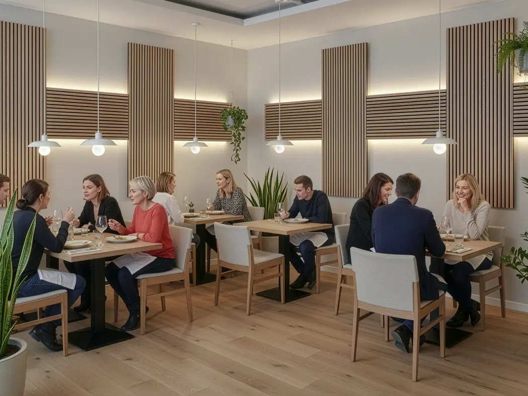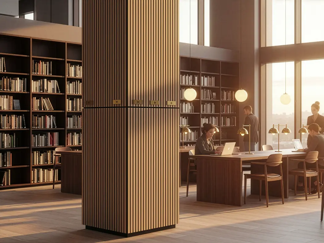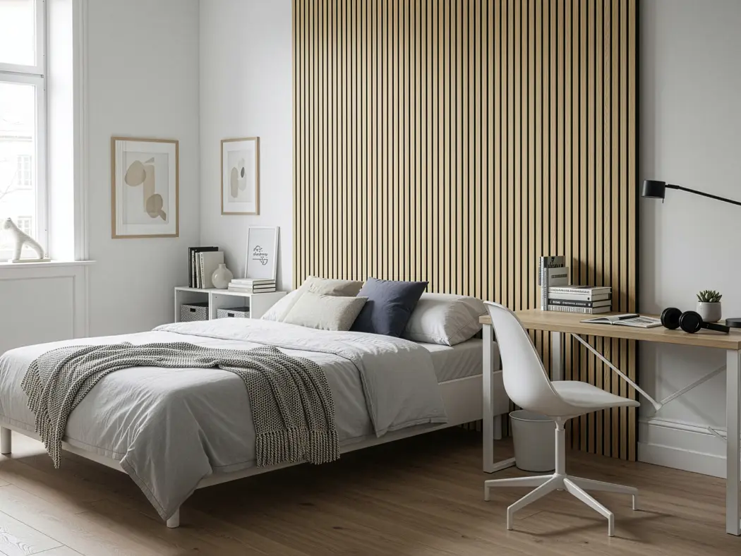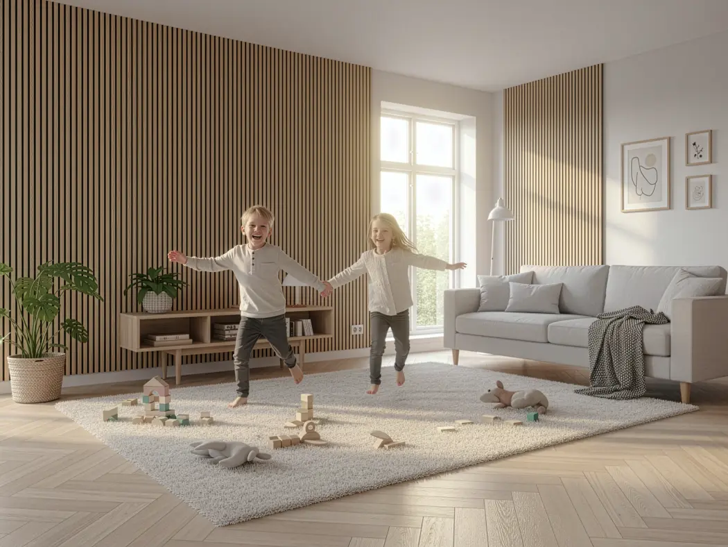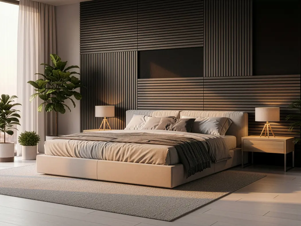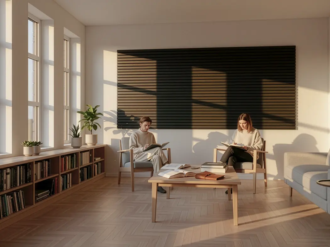 Painéis acústicos de madeira que combinam conforto, estética e funcionalidade. Compostos por MDF e fibra de poliéster PET, com propriedades de absorção sonora, oferecem um acabamento aconchegante. Seu design em estilo painel ripado melhora a absorção acústica. Uma solução sustentável e versátil para valorizar o design de qualquer ambiente.