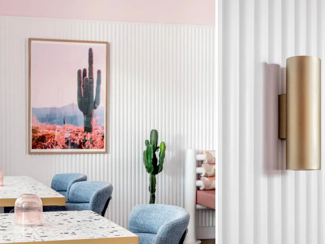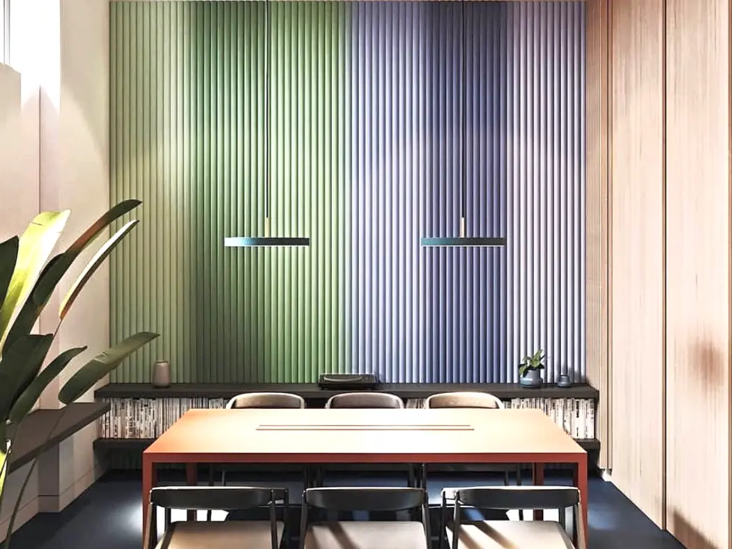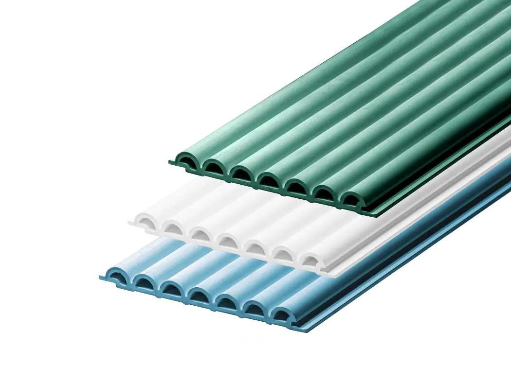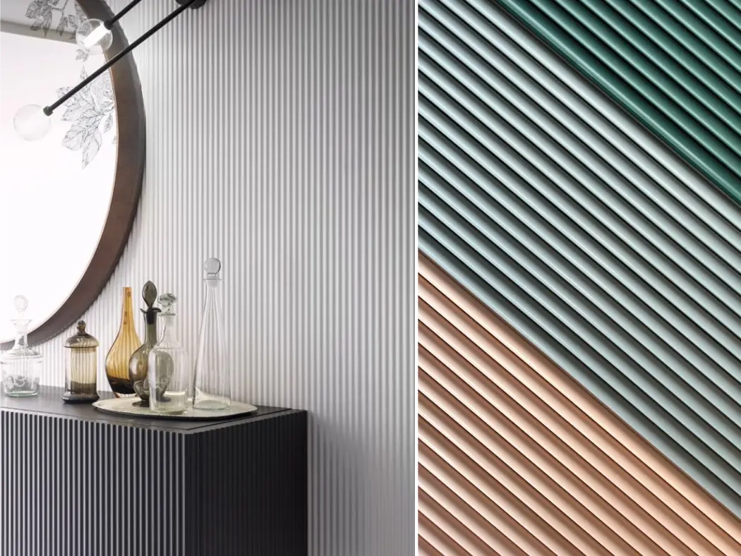 Revestimentos para interiores compostos de madeira ecológica e HDPE com diversas opções de formas, cartela de cores variada e fácil instalação.