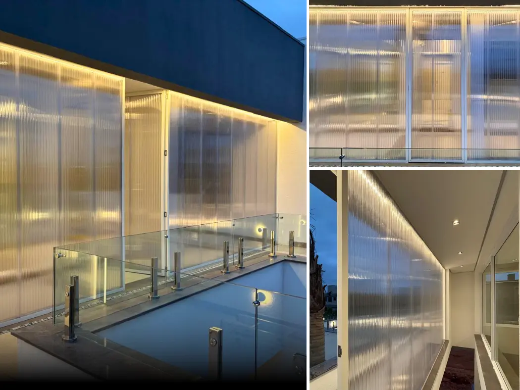 Painéis compostos de policarbonato estrutural translúcido ou leitoso, para fachadas e divisórias duráveis e fáceis de instalar. Ideais para obras com projetos luminotécnicos específicos, possuem filtro UV nas faces visíveis, o que lhes confere resistência ao sol sem perder a coloração.